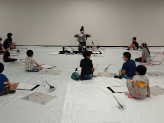床がピカピカ。整理整頓が行き届き感心!地域の中学校の美術部の生徒さんに墨、水、和紙による表現の面白さ-水墨画のワークショップに行ってきました。美術部員なんと70人。