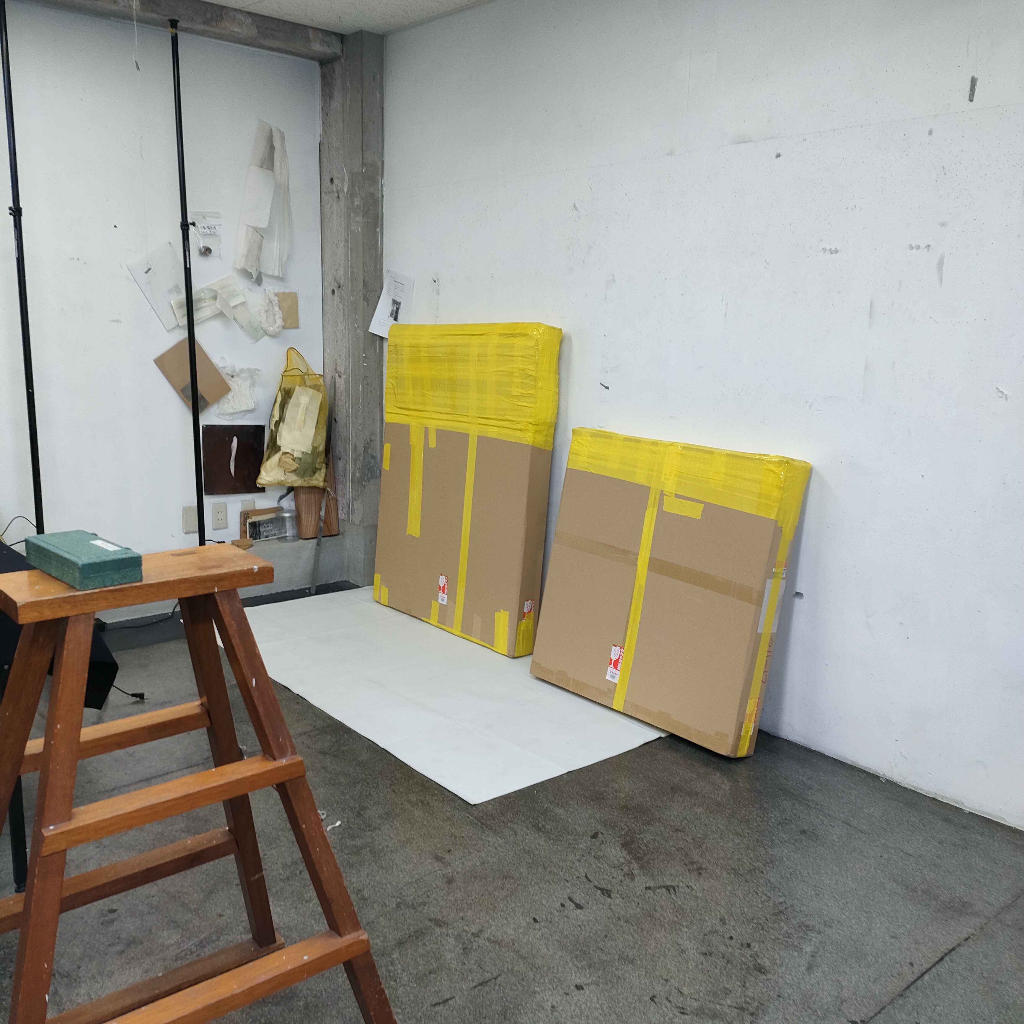 明日の準備と並行して、作品の梱包作業。遠くに輸送するため、念入りに梱包してます。どこまでやればよいのかが不明なのですが、箱に入れた作品を段ボウルで梱包。グルグル巻にしましたが、この状態でプチプチも必要かな?
